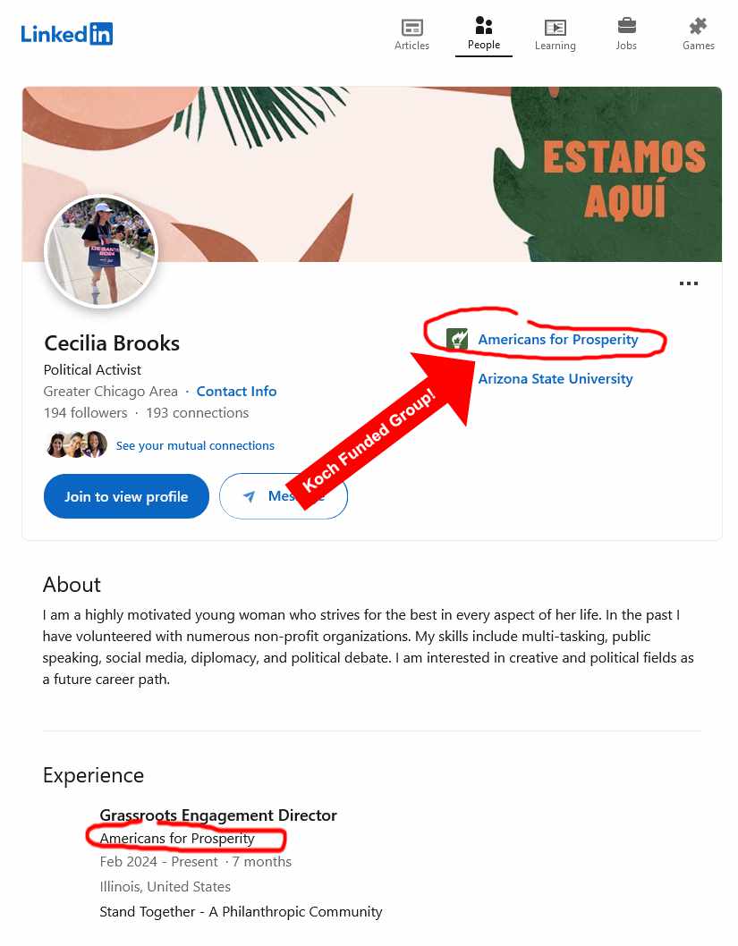 While Cecilia may live in Kane County and is posing as an ordinary citizen, in reality, she is a paid organizer with Americans for Prosperity, which is a Koch brothers backed and funded libertarian group.
